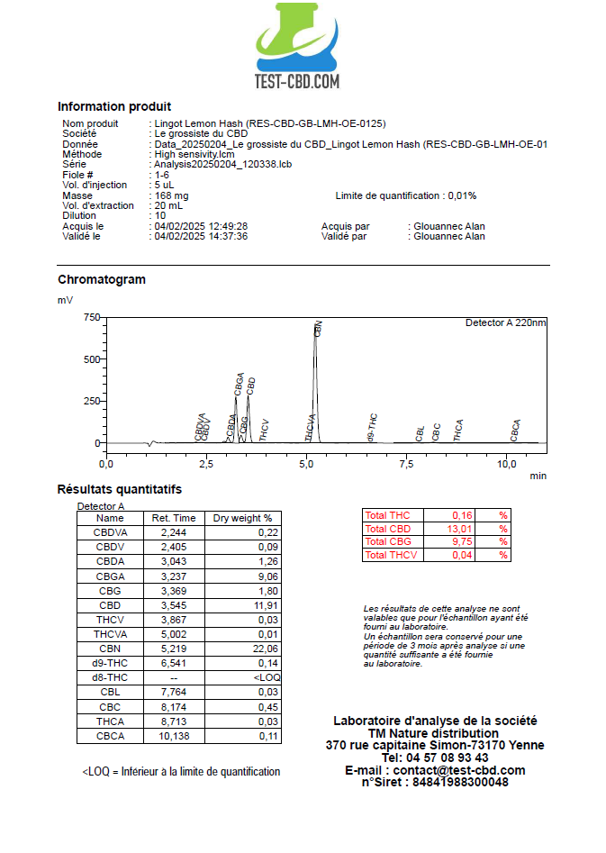 Teneur en cannabinoïdes : Cette résine a une concentration modérée en CBD, environ 35/38,5% , et une teneur en THC inférieure à 0,2%, conforme à la réglementation légale en vigueur.